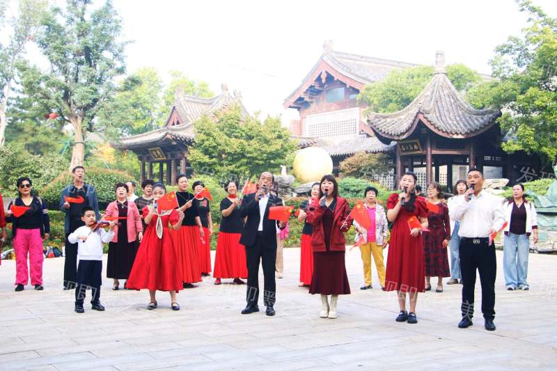 永利3044AM集团官网古城的庭院式广场上,飞檐翘角的古建筑与绿树相映,一群身着红装的表演者手持五星红旗,与穿白衬衫的领唱者并肩而立,童声小提琴与众人嘹亮的歌声交织。背景中巨大的“满月”装置与亭台楼阁相映,市民游客挥舞国旗加入合唱,红与古色的碰撞里,家国情怀随旋律流淌。