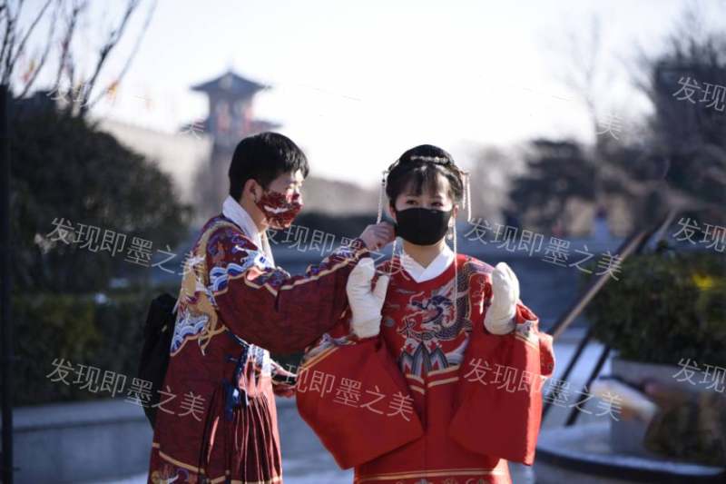 古城南门参加比赛选手,为搭档整理没戴好的口罩。