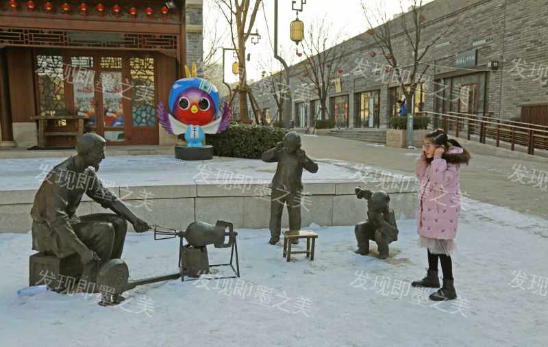 传统的爆米花作工,如今成了雕塑作品,也引来了孩童们的好奇
