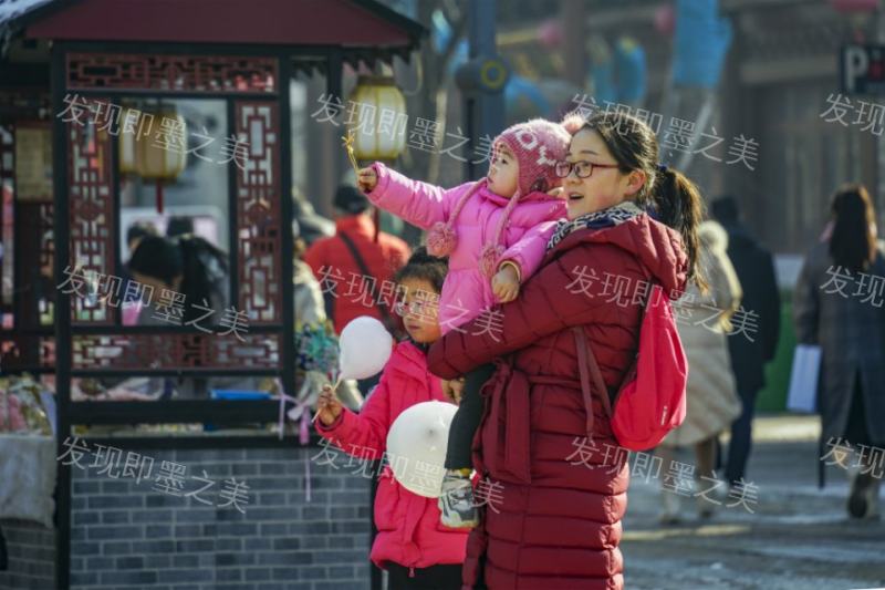 年轻的母亲带着两个孩子逛古城,也成一景。