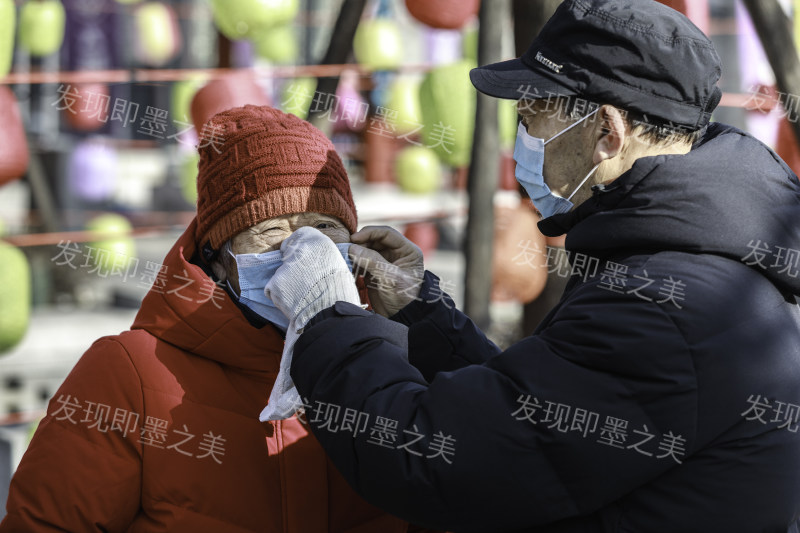 南戏台正在演着柳腔戏,看台旁一大叔在给老伴整理口罩,画面非常感人,老来为伴,相濡以沫,呵护终生。