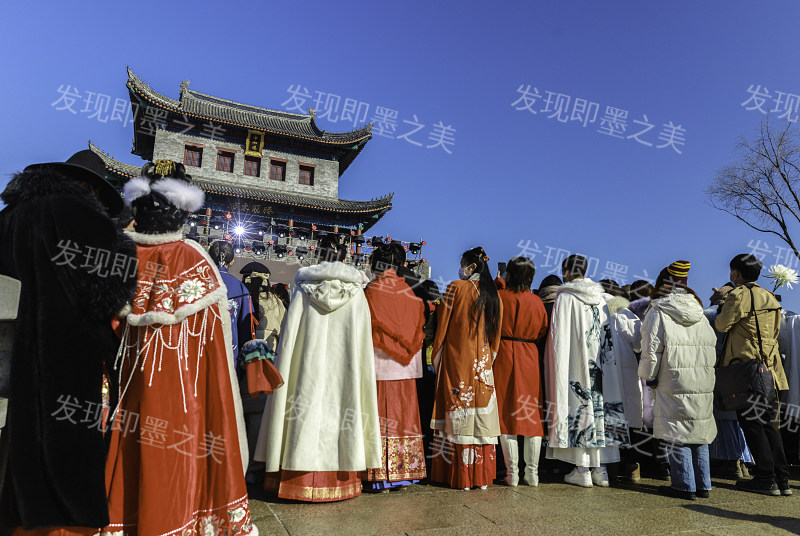 穿着各式汉服的一群女孩正在观看文化节闭幕式。这样成群式的穿着汉服,体现了年轻人对古典文化的热爱和对汉民族的自信。