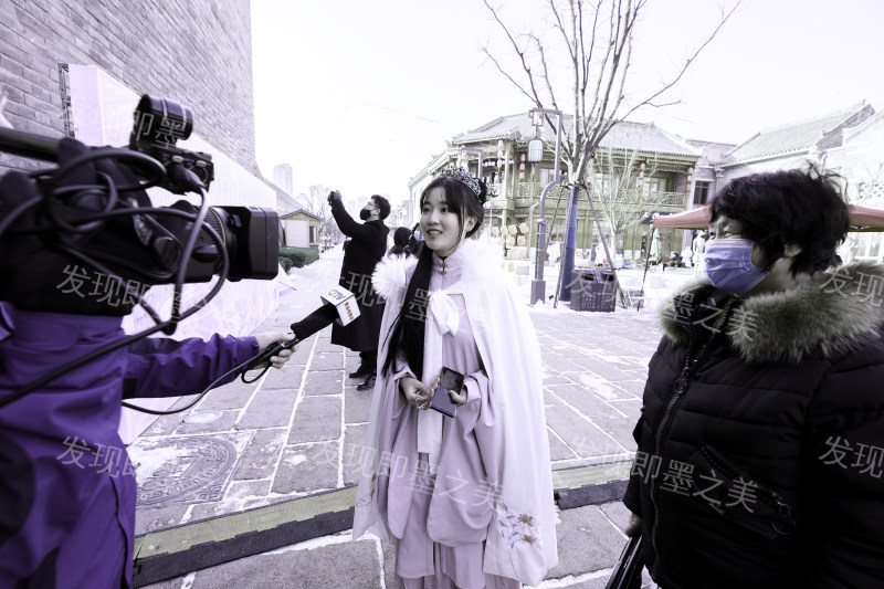 一女孩正在接受电视台记者的采访,畅谈自己对汉服的喜爱和对汉文化的兴趣,女孩的面部表情将其心理体现的淋漓尽致;一旁的母亲美滋滋的笑容,表现出了对女儿的满意。
